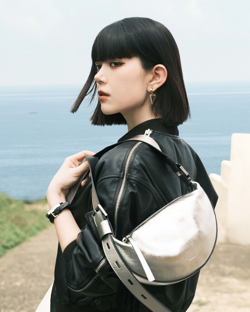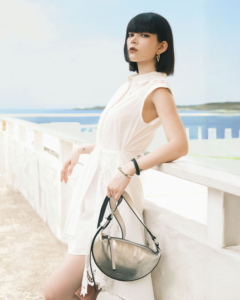 俐落剪裁的清爽白色洋装,可在设计细节中窥见强大的设计巧思,不规则剪裁让白系MONOTONE 营造出更显层次感的蕾丝布料裁片,是最让Kimberlly讚赏的亮点,大胆配上冲突的硬派皮革外套与银色半月包款,不仅呼应度假主题中海面波光粼粼的视觉,也让现代女子不单一多面向的特质,透过盛夏时节优游于城市与海岸交界的双重魅力一一展现。