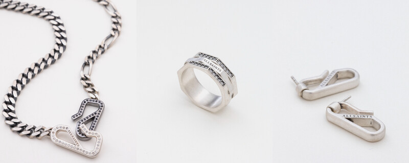 LOCKERS项鍊,定价NT12,800、OCTAGONAL EDGE戒指,定价NT5,600、LOCKERS耳环,NT2,600。 ALLSAINTS全省门市